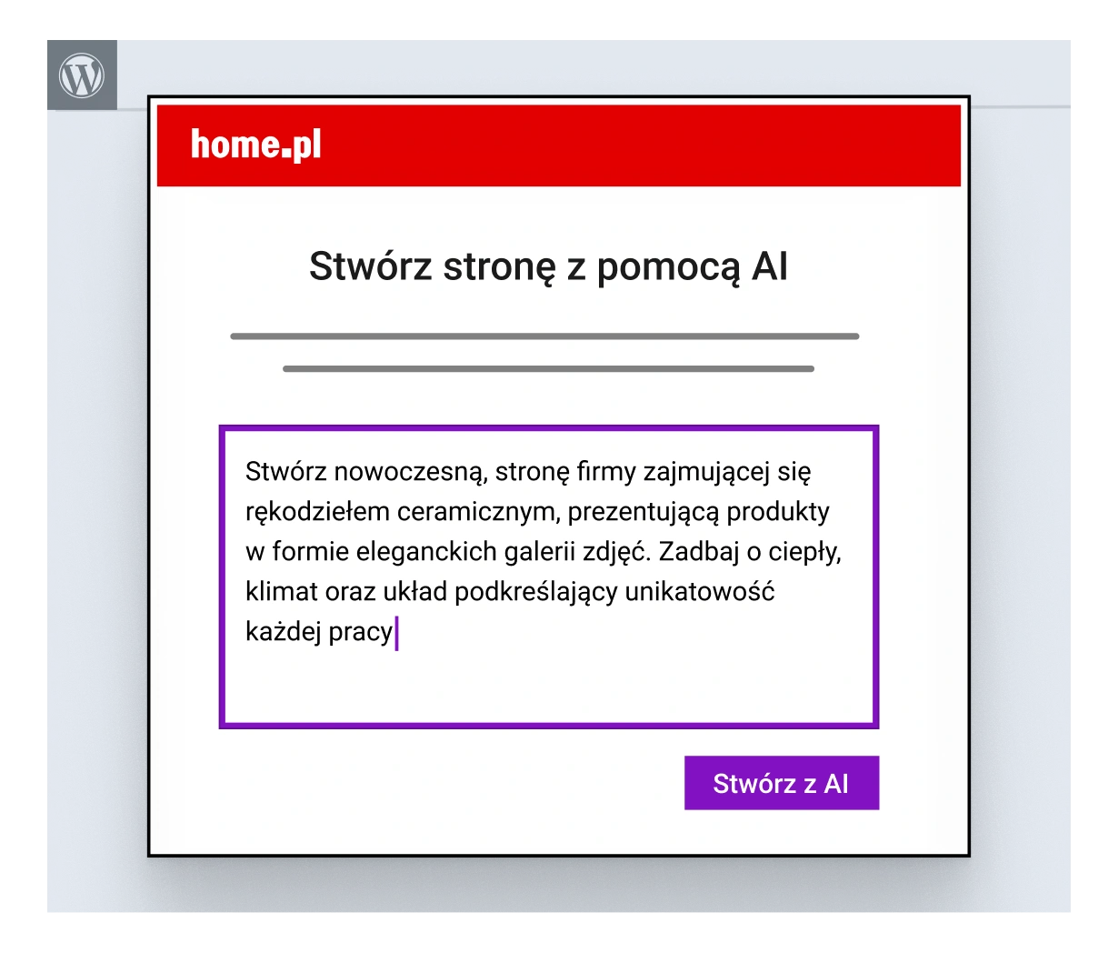 Kreator stron AI to asystent oparty o sztuczną inteligencję, który stworzy dla Ciebie stronę internetową w WordPressie. Wystarczy, że odpowiesz na kilka pytań i w skrócie opiszesz swoją działalność, by AI stworzyło dla Ciebie w pełni funkcjonalną stronę WWW w kilka minut.